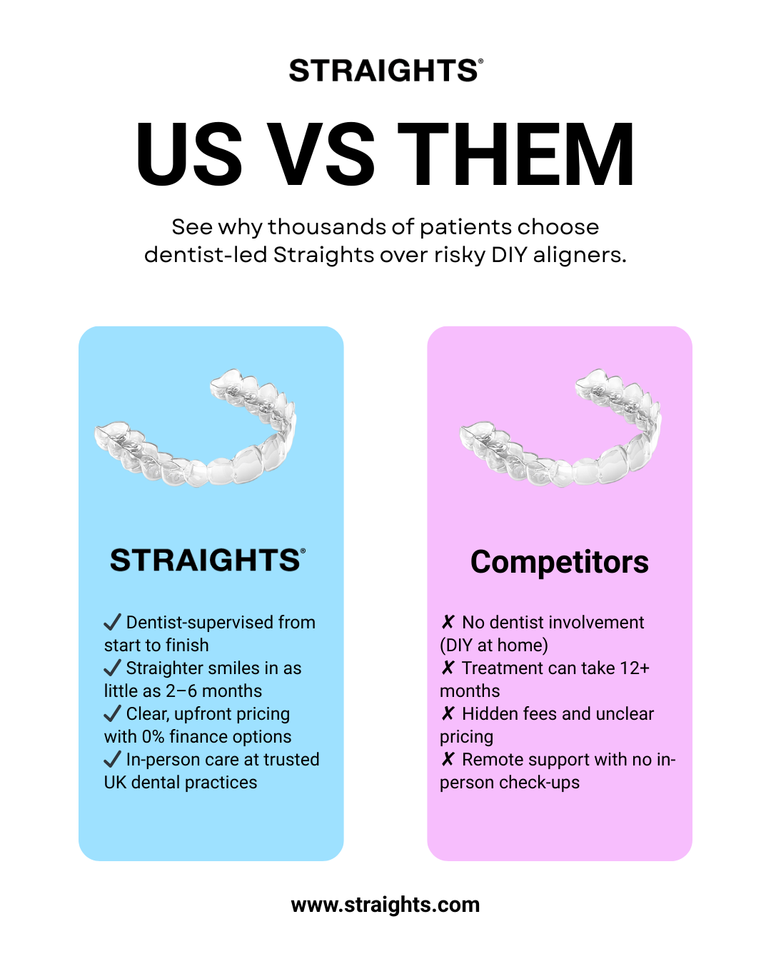Straights combines the convenience of at-home treatment with the safety of dentist supervision. Every case is planned and monitored by a qualified dentist for predictable, professional results.